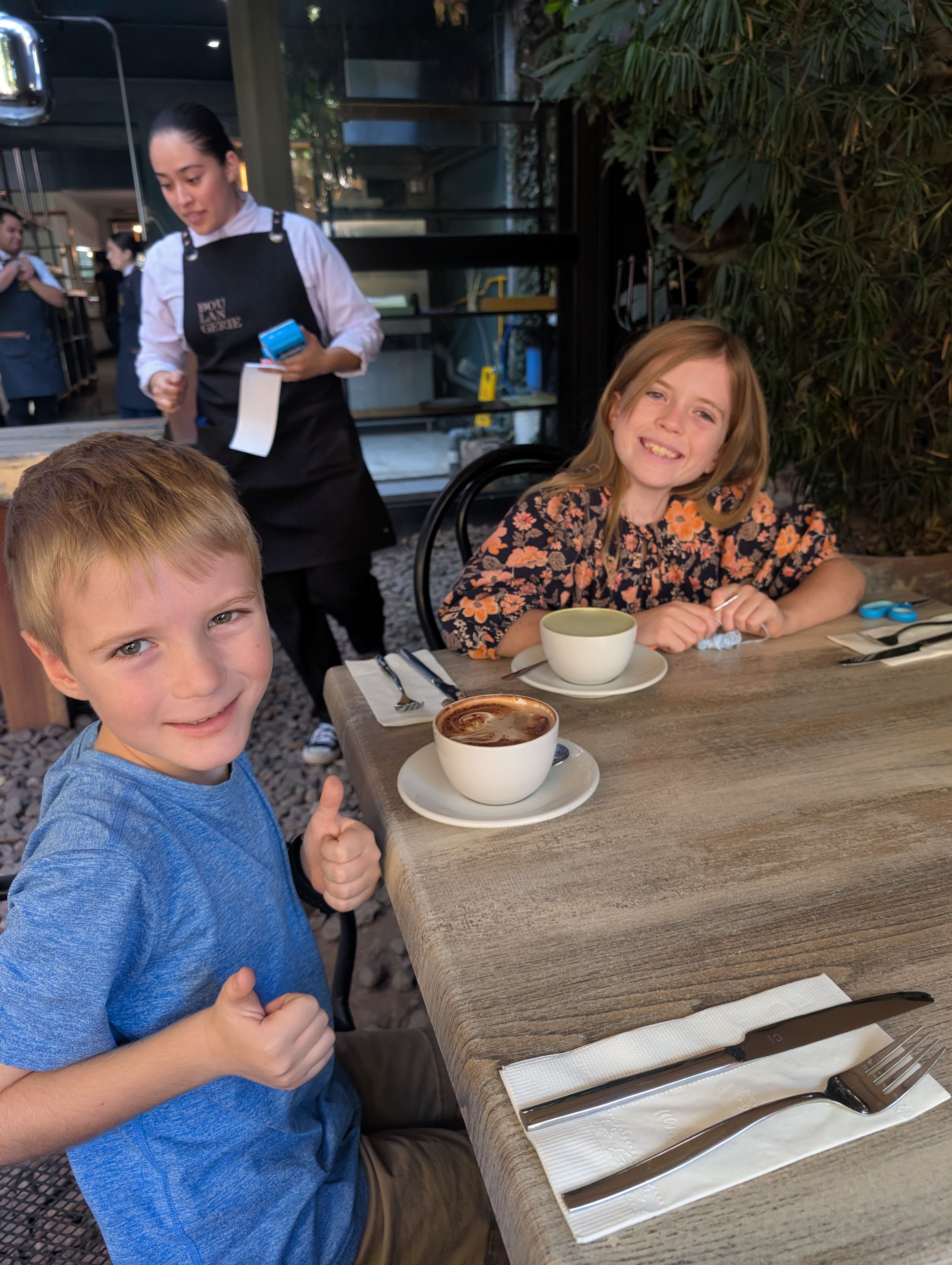 Over the weekend, we found a French bakery that completely won us over: Boulangerie C. The kids were in heaven, especially Garrison, who was thrilled by the French music playing in the background (he’s been learning French on top of Spanish!). Rebecca, of course, announced that we had to go back soon. Between bites of the best French toast I’ve ever had, she crocheted — her new favorite hobby. Garrison, ever the mocha lover, couldn’t stop talking about how perfect the foam art was. And yes, the drinks were delicious all around!