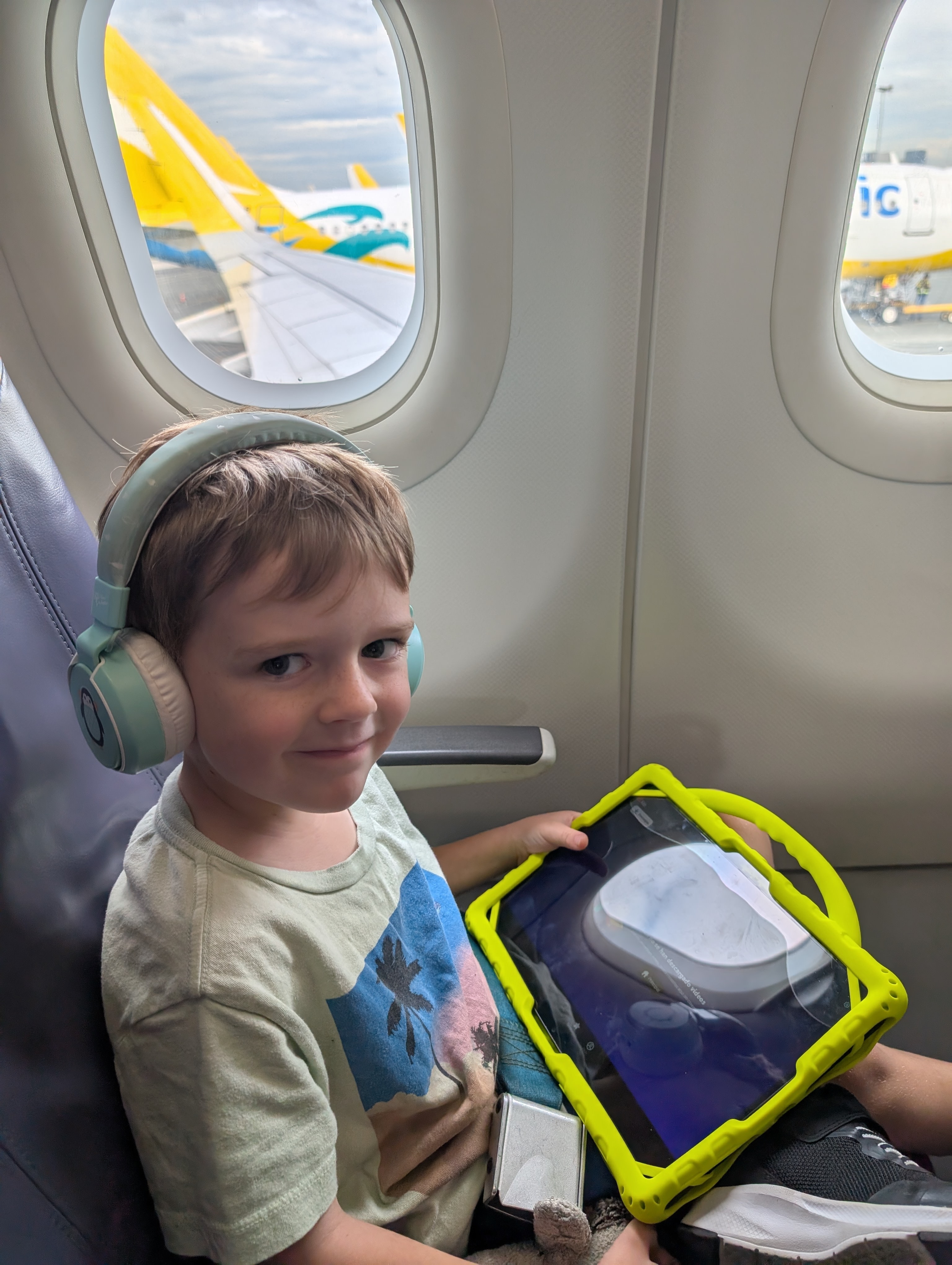 This setup means they stay happy and entertained for hours with just a tablet and headphones. For us, it’s a win-win. We already have so much to carry for the flight, so keeping them entertained without additional toys or activities makes things so much easier.